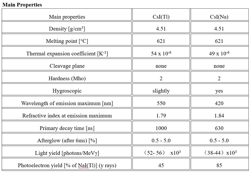 The light output of CsI(Tl) crystal is 45% of the NaI crystals, with a maximum emission peak at 550 nm, which matches well with silicon photodiodes, thereby greatly simplifying the readout system. Its decay time is related to the ionizing power of the incident particles, making it particularly suitable for detecting heavy charged particles in environments with strong γ-ray backgrounds. CsI(Tl) crystal is relatively soft and somewhat plastic, allowing it to be fabricated into various shapes and to withstand significant mechanical and thermal shocks. When used in air, it exhibits slight deliquescence compared to NaI crystal.